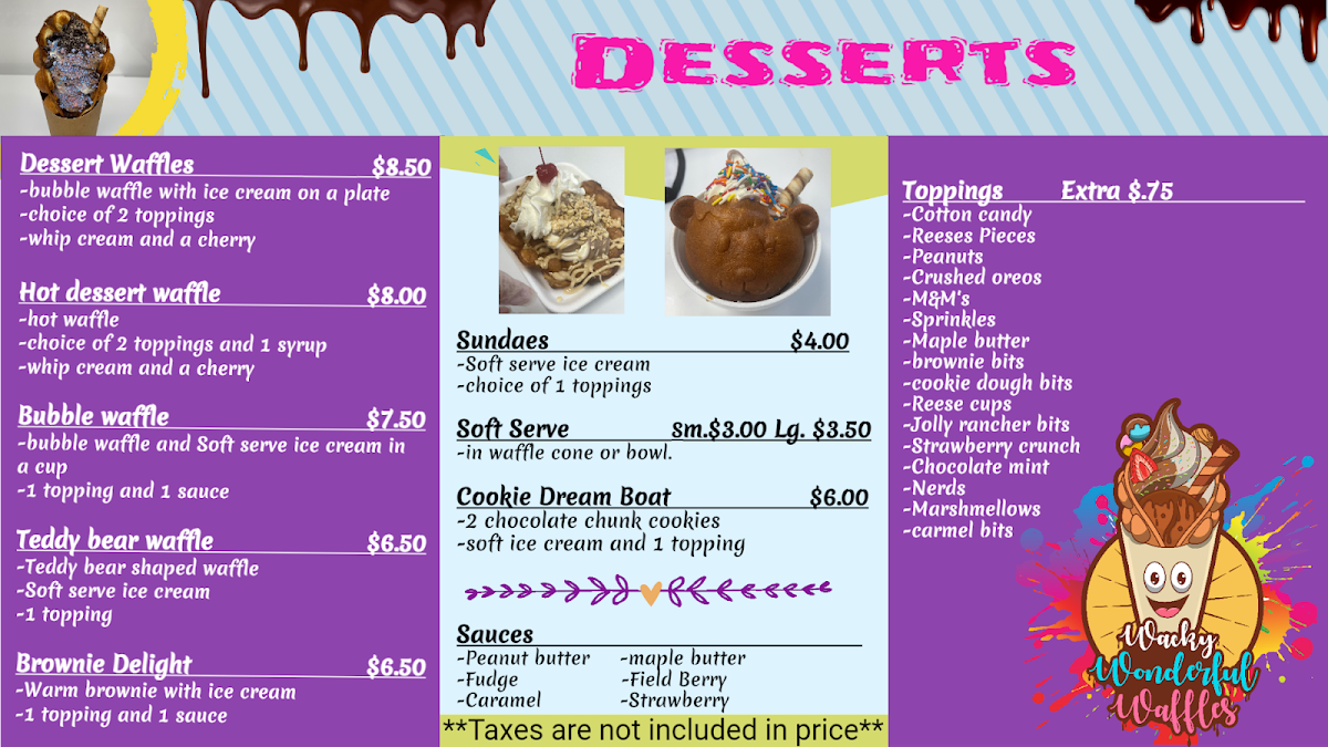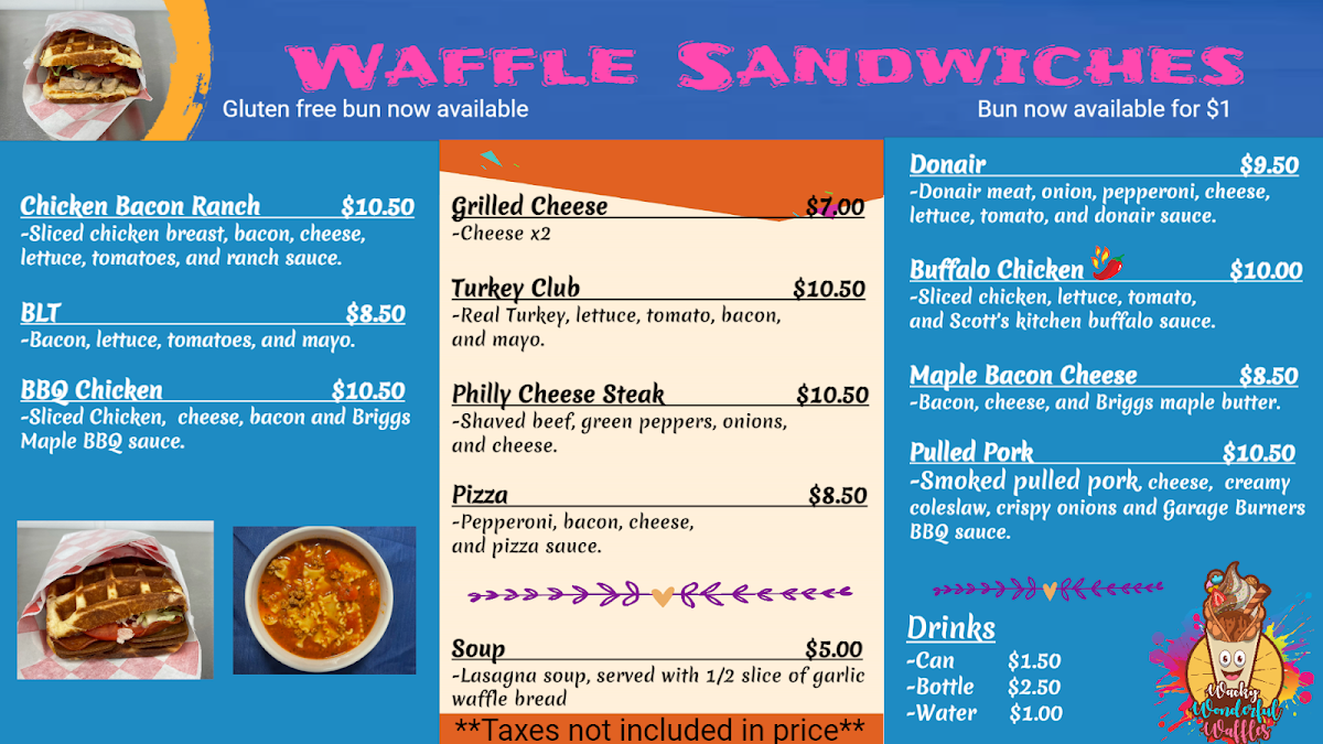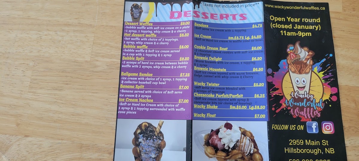 Welcome to Wacky Wonderful Waffles, a delightful haven located at 2959 Main St, Hillsborough, NB. This charming spot specializes in an array of delectable waffles, each crafted with care and creativity. Diners can indulge in unique dessert offerings like the melt-in-your-mouth Bubble Split ($9.50) and a rich Wacky Shake ($8.50), perfect for satisfying any sweet tooth.